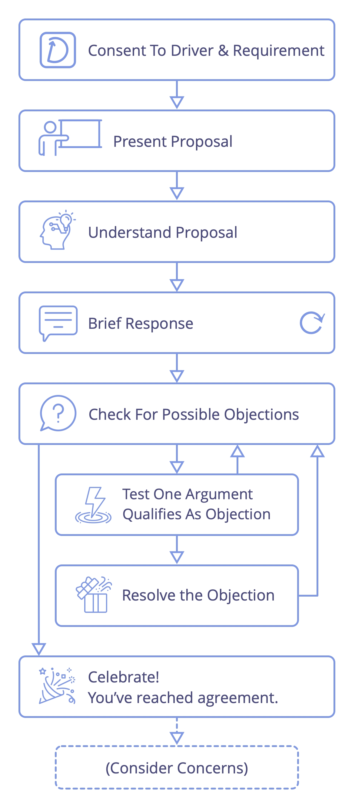 A (facilitated) group process for decision making: invite objections, and consider information and knowledge revealed to further evolve proposals or existing agreements.